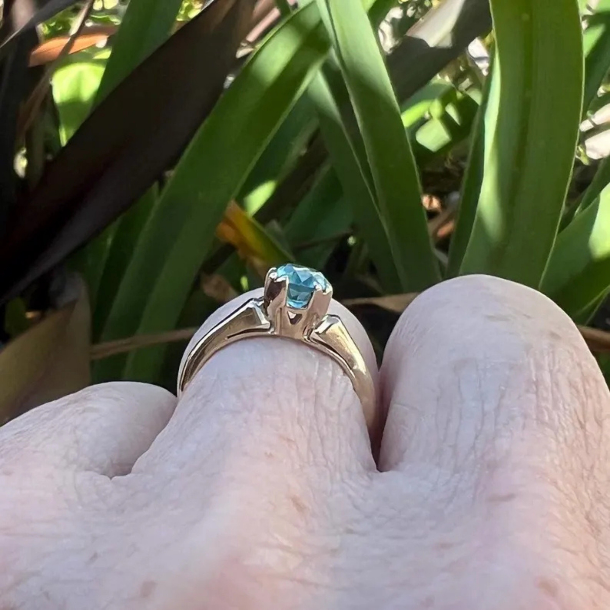 Celebrate timeless elegance with this 10k vintage blue topaz ring, a perfect alternative engagement or promise ring. The delicate blue topaz gemstone captures the enchanting glow of December’s birthstone, set in a beautifully minimal 10k white gold band.
