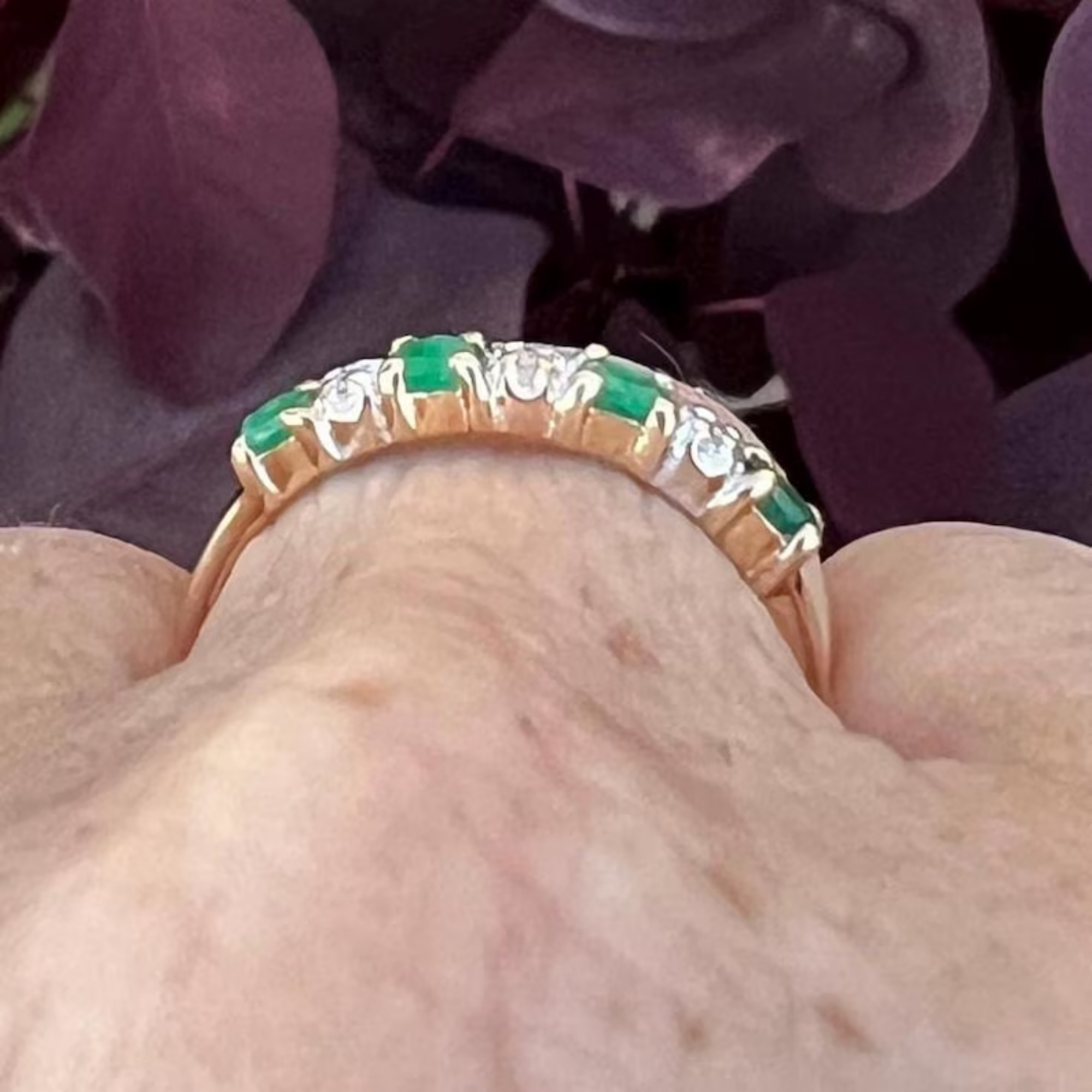 This Vintage Emerald and Diamond Band is a timeless estate piece crafted in 10k yellow gold, featuring four vivid emeralds and three sparkling diamonds, all securely prong-set. The round full-cut stones create a balanced, elegant look, making this band a perfect choice for everyday wear or special occasions.