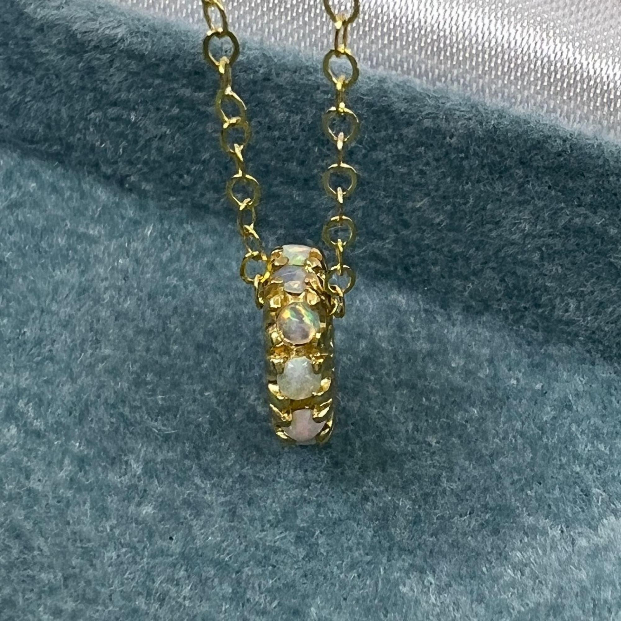 This delicate vintage opal charm bead brings a subtle yet captivating glow to any necklace. Crafted in solid 14k gold and stamped for authenticity, the natural opal bead measures 3 mm wide with a 4 mm inside diameter—perfect for sliding onto your favorite chain. This piece comes with an 18-inch 14k gold-filled chain for immediate wear. A timeless October birthstone treasure, ideal for layering or gifting.