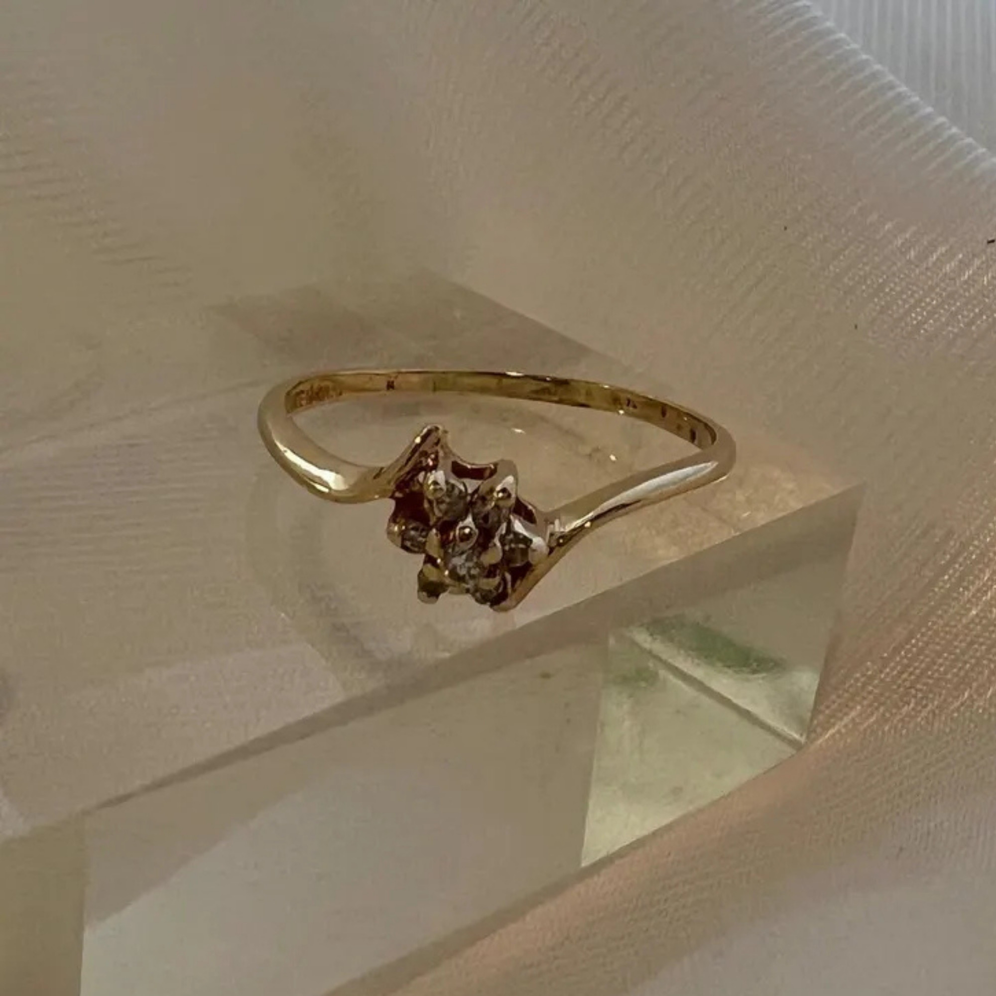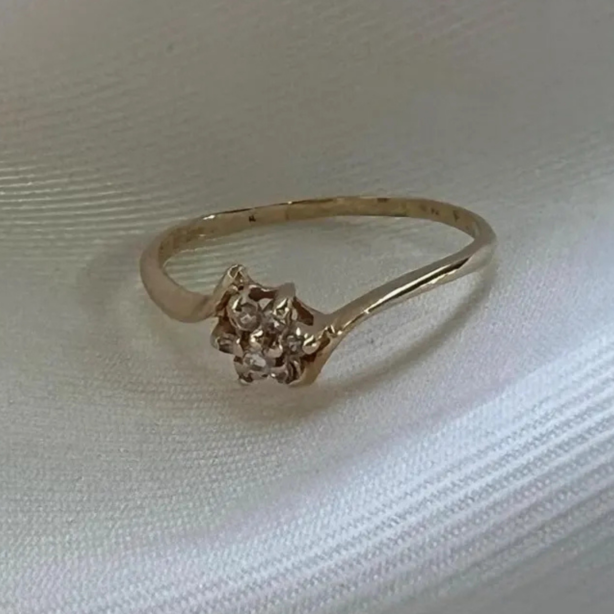 A delicate vintage 10k gold diamond cluster ring featuring 7 round-cut diamonds in a floral blossom design. Perfect as a promise ring, minimal engagement ring, or everyday vintage accessory.