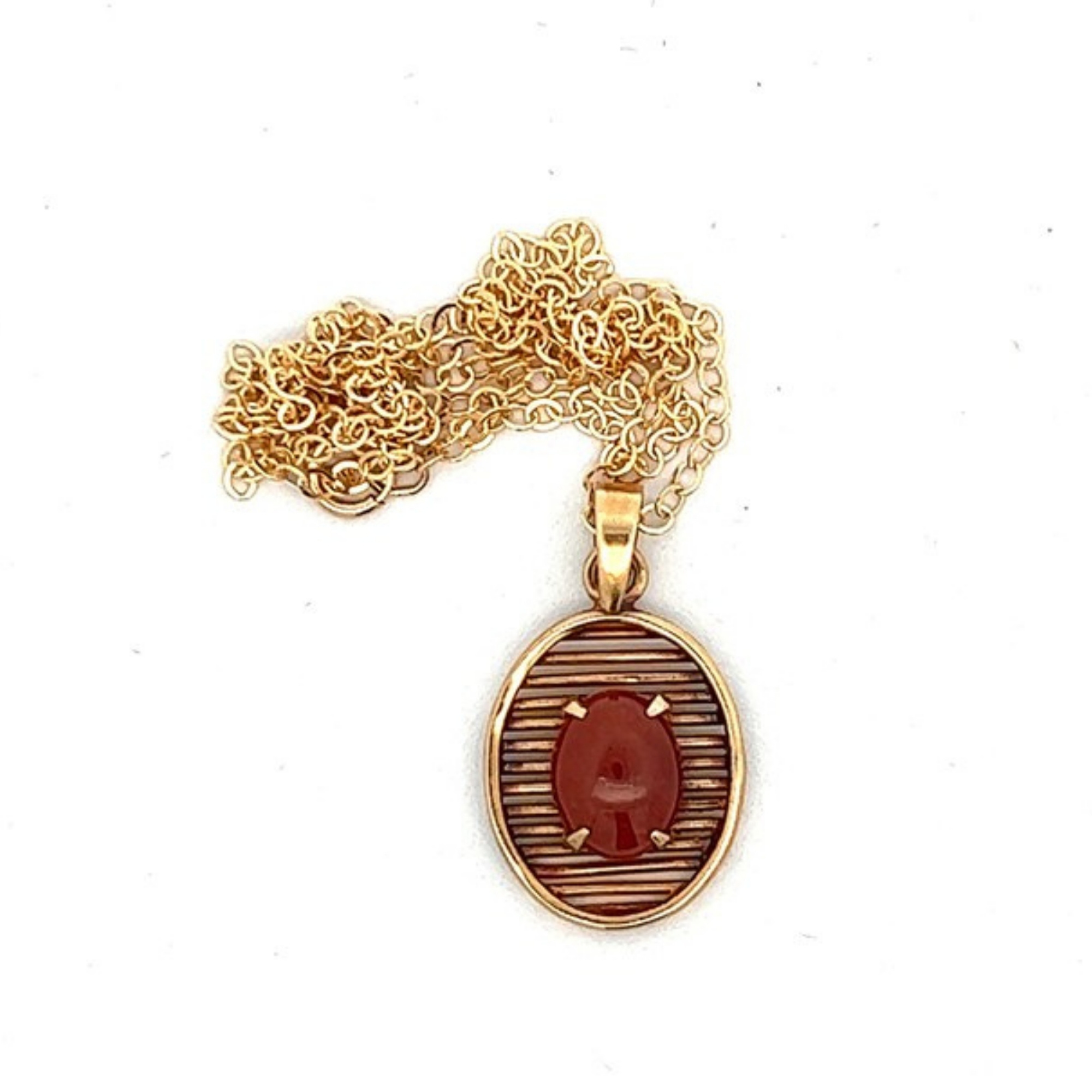 Vintage red jade pendant set in 14k yellow gold with an oval cabochon stone. Includes an 18-inch 14k gold-filled chain—perfect for layering or as a statement necklace.