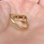 This vintage 18k Gold Garnet ring features three rich oval garnets set in a low-profile band—perfect for stacking, pinky wear, or as a unique standalone statement. Solid and well-crafted, this ring weighs 1.54 grams and carries a refined retro appeal from the 1980s. Its minimalist elegance and warm garnet tones make it a standout piece for vintage lovers.
