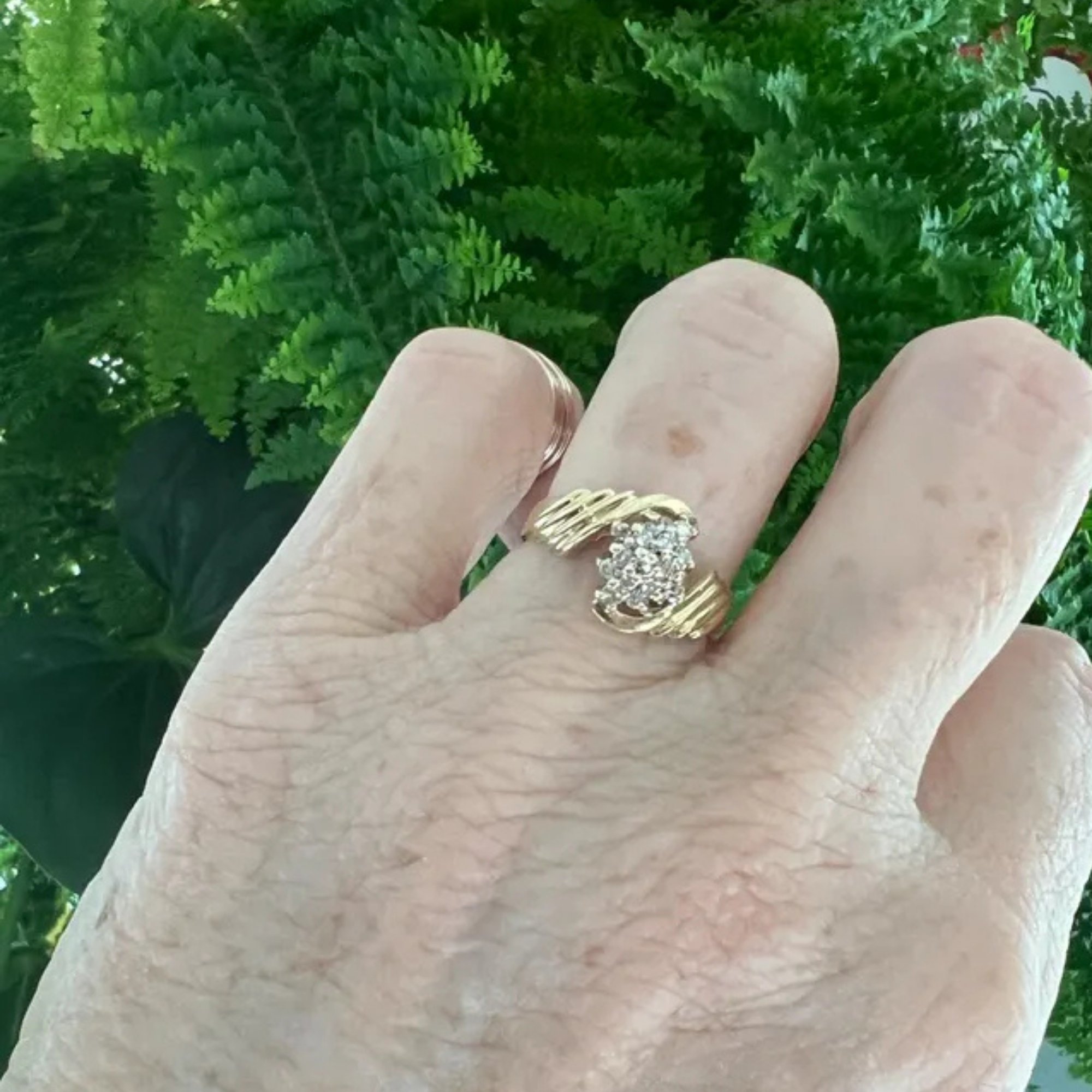 Vintage 14k yellow gold bypass ring with a dazzling 15-diamond waterfall cluster. Size 6½. Perfect for anniversaries or statement occasions.