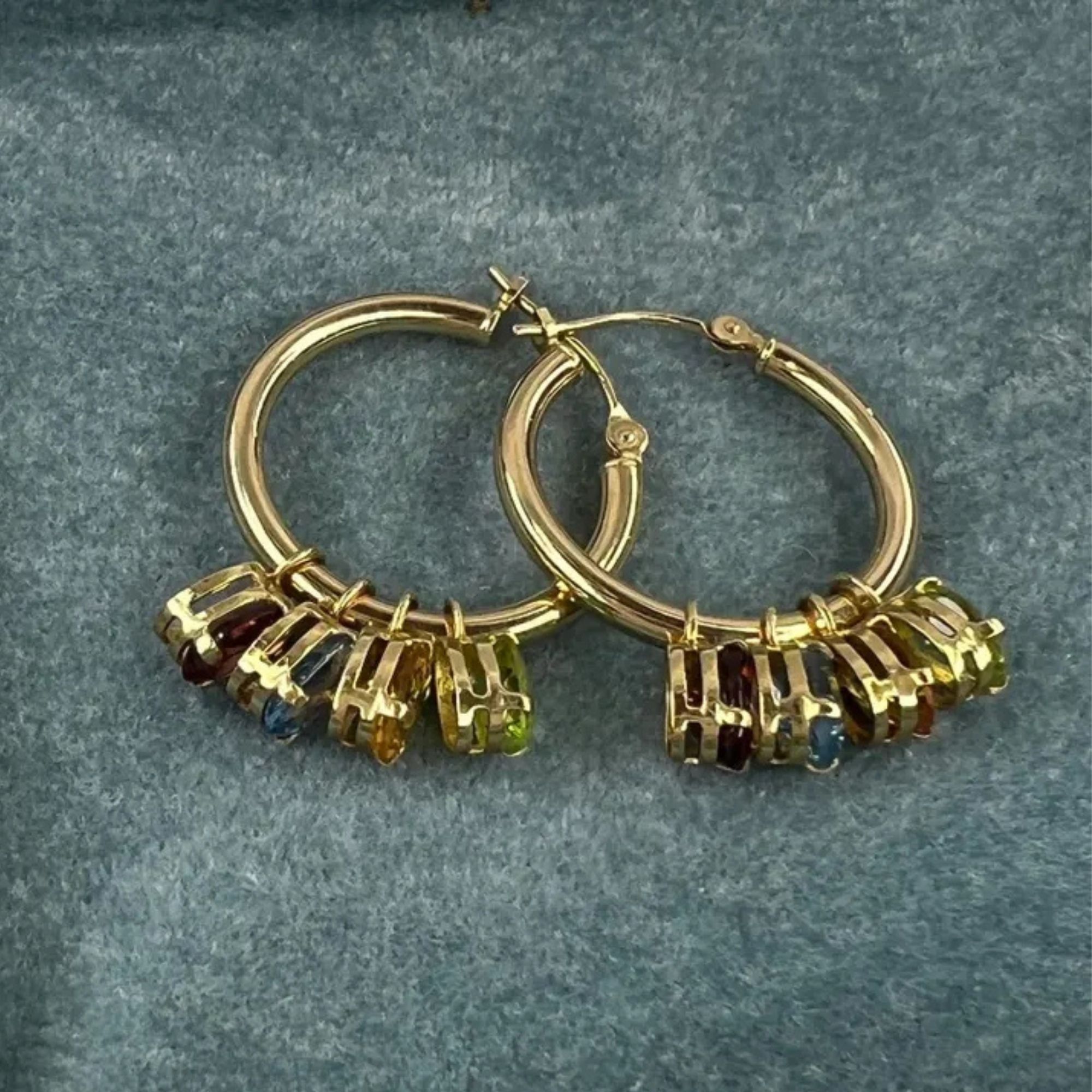 Vintage solid gold hoop earrings featuring multi-color gemstone charms—citrine, topaz, and garnet. Lightweight, stackable, and ideal for effortless everyday wear.